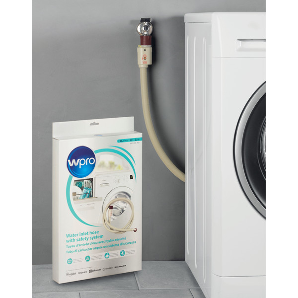 Wpro vandindløbsslange med sikkerhedssystem er udstyret med et sikkerhedssystem til forebyggelse af lækager og overløb. Passer til alle vaskemaskiner, kombinerede vaskemaskiner/tørretumblere og opvaskemaskiner. Dimensioner: Ø 20,27 mm - 3/4" - 2,5 m. Hun/Hun. Lige/Vinklet.